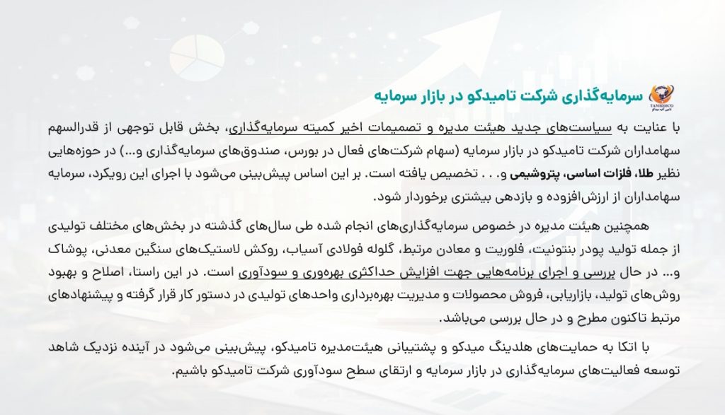 با عنایت به سیاستهای جدید هیئت مدیره و تصمیمات اخیر کمیته سرمایهگذاری، بخش قابل توجهی از قدرالسهم سهامداران شرکت تامیدکو در بازار سرمایه (سهام شرکتهای فعال در بورس، صندوقهای سرمایهگذاری و…) در حوزههایی نظیر طلا، فلزات اساسی، پتروشیمی و. . . تخصیص یافته است. بر این اساس پیشبینی میشود با اجرای این رویکرد، سرمایه سهامداران ...